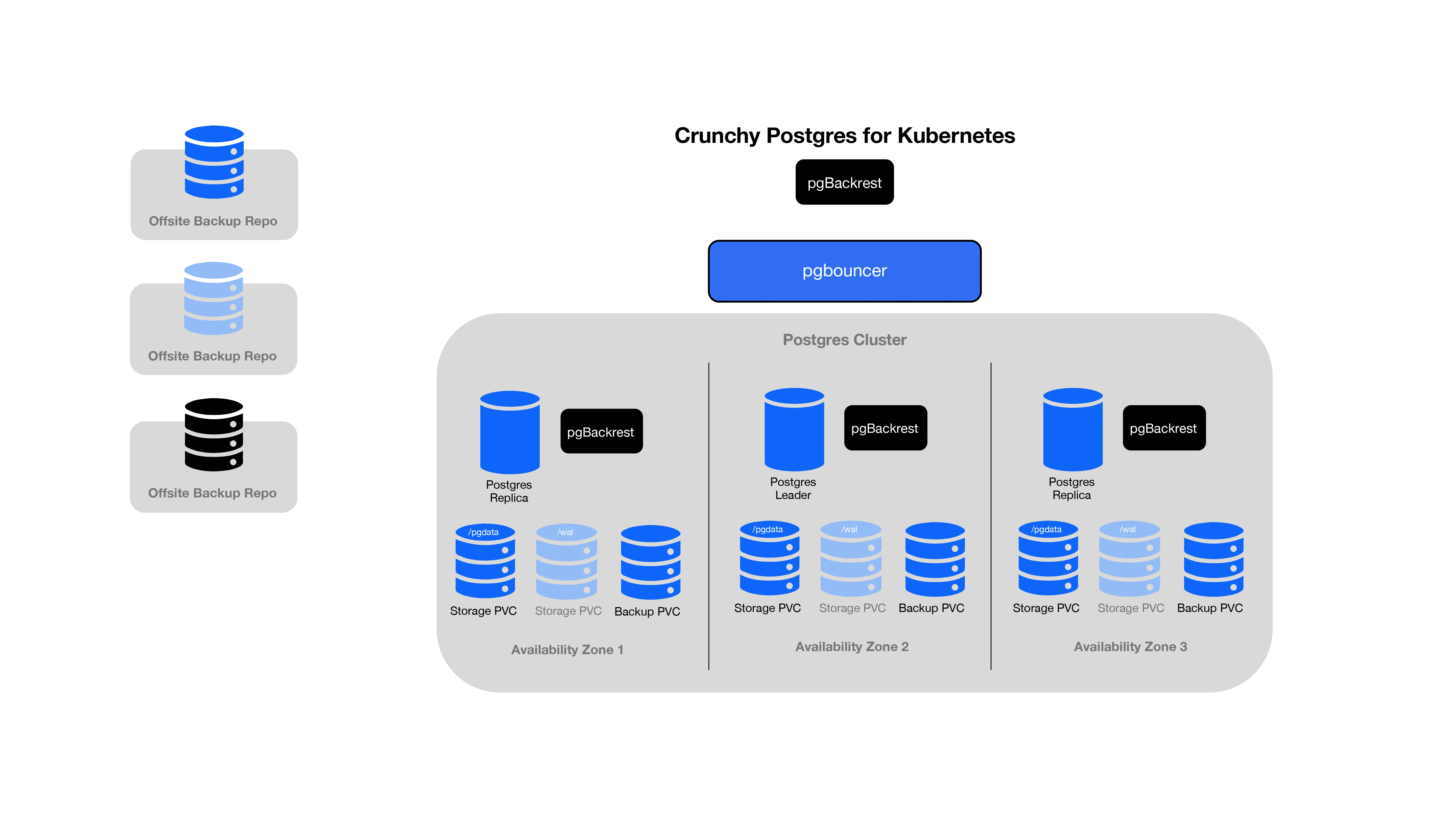 Crunchy Data for Kubernetes delivers layered protection to meet these objectives effectively. At its core is a default, comprehensive backup strategy, utilizing pgBackRest. This helps facilitate spreading your PostgreSQL cluster across Availability Zones (AZs) or data centers. This configuration guarantees swift, automated recovery from hardware and data center disruptions. Furthermore, it includes automated onsite and off-site backups to highly redundant storage solutions like S3, enhancing geographical redundancy with options for cross regional warm standbys and emergency "break-glass" cold storage recovery. Crunchy Data for Kubernetes also leverages PostgreSQL's inherent replication modes, enabling cross-region "warm" standbys.
